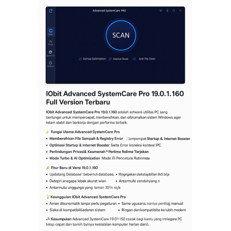 IObit Advanced SystemCare Pro 19.0.1.160 adalah software utilitas PC yang berfungsi untuk mempercepat, membersihkan, dan mengoptimalkan sistem Windows agar tetap stabil dan bekerja dengan performa terbaik. Versi terbaru ini hadir dengan peningkatan fitur cerdas yang mampu mendeteksi masalah sistem secara otomatis dan memperbaikinya hanya dengan satu klik.